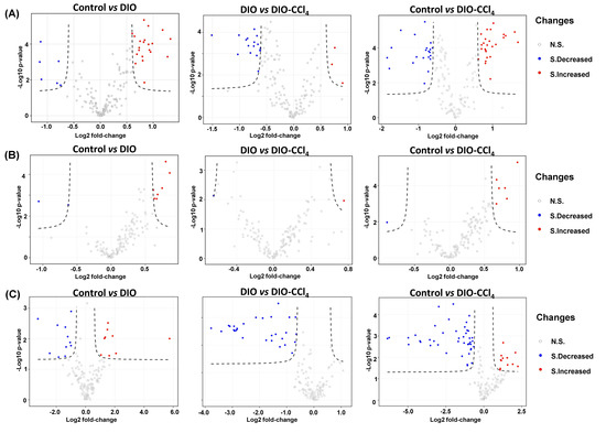 Figure 4. Volcano plots of metabolic features of liver (A), serum (B) and intestine content (C).