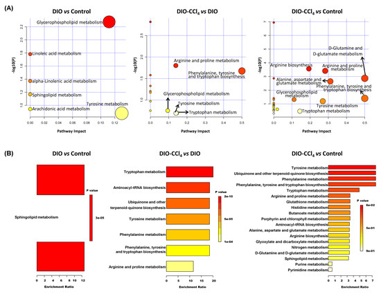 Moreover, metabolite enrichment analysis was conducted using quantitative metabolite data (Figure 5B). Only sphingolipids (SPs) metabolism was changed (DIO vs. control, p < 0.05), while five sets exhibited high significance between DIO-CCl4 and control (p < 0.05), which corresponded to tyrosine metabolism, ubiquinone and other terpenoid-quinone biosynthesis, phenylalanine metabolism, phenylalanine, tyrosine and tryptophan biosynthesis, and tryptophan metabolism. In addition, the disturbed pathways between DIO-CCl4 and DIO were very similar to those between DIO-CCl4 and control, indicating that the disturbance of DIO-CCl4 was mainly correlated to additional treatment of CCl4.