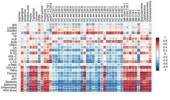 Correlation analysis was performed to obtain a visualized understanding of the relationship between metabolome and NAFLD-associated parameters (Figure 6, Table S4). Clinical parameters, including body weight (BW), liver/BW ratio, TNF-α and α-SMA, were not associated with the differential metabolites. While ALP, ALB, BUN, serum TG, hepatic TG, Col-1a1 and hallmarks of liver function (such as fibrosis, steatosis, ballooning, inflammation and NAS Score) were significantly correlated to the differential metabolites. Among them, Col-1a1, ALT, AST, hallmarks of liver function, serum TG and hepatic TG shared the same pattern, while ALP and BUN shared the same pattern. Most of the metabolites, except arginine, were correlated to the clinical parameters. The levels of Col-1a1, ALT, AST, hallmarks of liver function were positively associated with the levels of asparagine, proline, tryptophan, tyrosine, t4 OH proline, putrescine, lysoPC a C18:1, several carnitines and sphingomyelins (SM). In contrast, the levels of several phosphtidylcholines (PC) showed the inverse pattern.