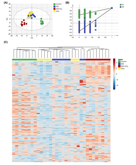 Figure 7. The metabolomic analysis of liver among control, model and OCA treated groups. (A) PLS-DA score plot of liver. (B) Model validation of PLS-DA using a permutation test with 200 cycles. (C) Heatmap of metabolic features of liver.