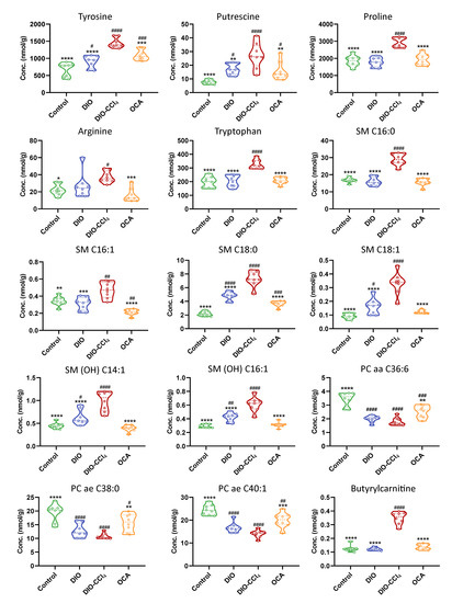 Figure 8. Violin plots of the differential metabolites of liver. * p < 0.05, ** p < 0.01, *** p < 0.005 and **** p < 0.001 vs. the DIO-CCl4 group; # p < 0.05, ## p < 0.01, ### p < 0.005 and #### p < 0.001 vs. the Control group.