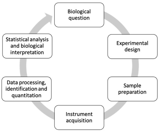 The metabolomics workflow typically begins with the biological question—the purpose and aims of a particular study, which can be hypothesis- or non-hypothesis-driven. The second step consists of the experimental design which addresses how the study will attempt to answer the biological question. Within this step, researchers determine if the study will use a targeted or untargeted approach wherein the latter seeks to analyze all the metabolites of a biological system, as opposed to the former, which focuses on identifying and quantifying select metabolites or classes of metabolites. Sample size, sample type (biological fluids or tissues), and sample collection are also determined within this step. Following experimental design, sample preparation techniques are then considered and are dependent on the sample size, type, costs, throughput and resources available. This step is the most critical aspect in the workflow since the type of sample preparation method employed, can have an enormous effect on the observed metabolite profile and in turn, the accuracy of biological interpretation [8]. Instrumental acquisition is the fourth step in the workflow wherein the most commonly used analytical techniques for identifying and quantifying metabolites are nuclear magnetic resonance (NMR) or mass spectrometry (MS) which can be paired with either gas chromatography (GC-MS) or liquid chromatography (LC-MS). The final steps—steps 5 and 6—consists of data processing and statistical analysis. Once metabolomics data has been acquired via the abovementioned instrumentation, these last steps of the metabolomics workflow help to reduce the complexity of the original data files into an understandable and useable data matrix containing enhanced significant metabolite signals across the various sample groups analyzed.