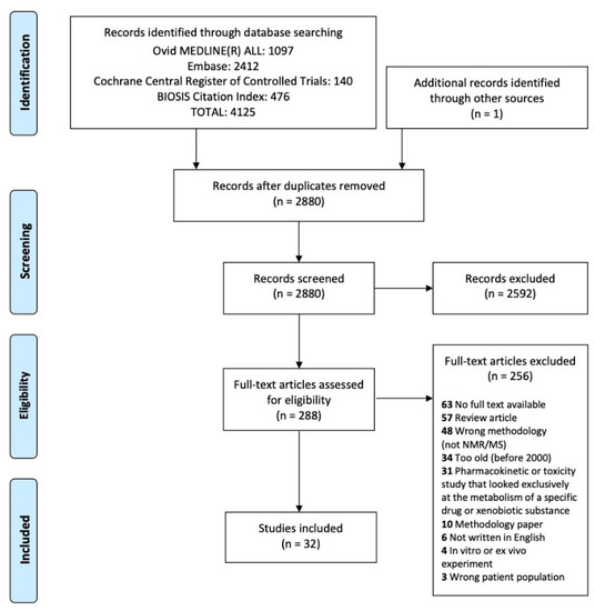 Our protocol was registered on Open Science Framework on 3 December 2020 [55]. Strategies were developed for four databases, including OVID Medline ALL, OVID Embase, OVID Cochrane Central Register of Controlled Trials and BIOSIS Citation Index in Web of Science, by a health sciences librarian [MA]. The initial results were downloaded 26 January 2021. Appropriate subject headings and keywords for psoriasis and psoriatic arthritis as well as metabolomics and lipidomics were used for each database. Non-human studies were removed; however, no date, age, language or other limits were applied. For complete strategies (see Supplementary File S1). The search strategy yielded 2880 abstracts after duplicates were removed, which were then screened by two members [JK, NL] of the research team based on predetermined inclusion criteria: (1) Study involved subjects with psoriasis and/or psoriatic arthritis; (2) study examined endogenous metabolites in human subjects; (3) study used nuclear magnetic resonance (NMR) or mass spectrometry (MS) as the analytical technique. We excluded case reports, in vitro or ex vivo experiments, methodology papers, review articles, articles published before 2000, articles not written in English and pharmacokinetic or toxicity studies that looked exclusively at the metabolism of specific drug or xenobiotic substance. Two reviewers [JK, NL] independently assessed all titles and abstracts. 288 abstracts were selected for full-text review, full-text articles could not be found for 63 abstracts and 32 articles met all criteria (Figure 2). Data were extracted from the included studies using a piloted standardized form.