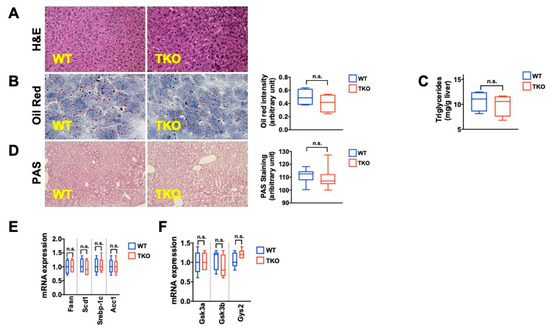 TKO are indistinguishable from WT mice on regular chow diet (A) H&E staining demonstrates normal liver architecture in TKO mice (B) Oil Red O (ORO) staining indicates similar triglyceride levels between TKO and WT mice (right graph shows quantification) (C) Biochemical TG quantification shows similar levels in WT and TKO mice (D) Periodic-Acid-Schiff (PAS) staining indicates similar glycogen content in WT and TKO mice (E) RT-qPCR demonstrates no differences in the expression of genes regulating TG biosynthesis (F) RT-qPCR demonstrates no differences in the expression of genes regulating glycogen biosynthesis. 5–8 mice were analyzed per group for each experiment and statistical differences were calculated by t-test. n.s. = not significant.