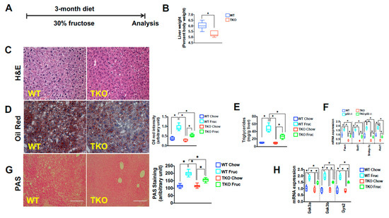 Mice with short telomeres accumulate less fat in liver tissue upon fructose treatment (A) Schematic fructose treatment regime and duration; (B) Fructose-treated TKO livers are smaller than WT livers (C) H&E staining shows fewer fat vacuoles in TKO liver tissue, indicating decreased fat content; (D) Oil Red O staining demonstrates reduced fat accumulation in TKO mice, the right graph shows quantification; (E) TKO mice have significantly less hepatic triglycerides (TG) as determined by biochemical analysis; (F) TKO mice have lower transcript levels of genes regulating TG synthesis based on RT-qPCR analysis; (G) PAS staining demonstrates decreased glycogen content in TKO mice; (H) TKO mice have lower transcript levels of genes regulating TG synthesis based on RT-qPCR analysis. 8–10 mice per group were analyzed for each experiment and statistical differences were calculated by t-test. * denotes p < 0.05.