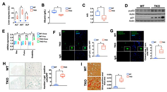 Recent studies have demonstrated that telomere dysfunction and the DNA damage response-associated activation of p53 converge on cellular metabolism by downregulating major regulators of cellular metabolism including Sirt1, PGC-1α, and PGC-1β [40,45,46]. The downregulation of these factors is associated with reduced mitochondrial biogenesis and function, as reflected by increased ROS levels and reduced ATP synthesis capacity, particularly in the face of liver damage induced by hepatotoxins [41]. To probe the functional relevance of these alterations under metabolic stress conditions, we exposed TKO and control WT mice to a high fructose diet reasoning that the increased demand to metabolize this sugar might uncover a functional impairment when telomeres are critically short. To this end, eight-week-old TKO and WT mice were exposed to 30% fructose and followed for three months (Figure 2A). Under these conditions, TKO mice were undisguisable from WT mice in their food and water intake as well as energy expenditure (Figure S2A–C, n = 5 per group). TKO livers were significantly smaller than their WT counterparts at the end of the study, indicating less fat accumulation (Figure 2B; n=10 per group; p < 0.05). Indeed, TKO mice accumulated significantly less fat in the liver as assessed by H&E, ORO, and biochemical analysis (Figure 2C–E; n = 10 mice; two independent experiments; p < 0.05). Compared to control WT mice, TKO mice displayed approximately 50% less hepatic TG accumulation (Figure 2D,E; n = 6 mice; p < 0.05). The reduced TG content in TKO mice was paralleled by a blunted expression of lipogenic genes including SREBP-1c, FASN, ACC1, and SCD1 compared to WT mice on a fructose diet (Figure 2F; n = 6; p < 0.05). A clear transcriptional response to fructose was noticeable in TKO mice as the expression of TG-synthesizing enzymes was increased compared to TKO mice on regular chow, although this response was blunted compared to WT mice on a fructose diet (Figure 2F; n = 6; p < 0.05). Similarly, the hepatic glycogen content was significantly reduced in TKO mice in response to fructose, which was associated with a decreased expression of the glycogenic enzymes Gsk3a, Gsk3b, and Gys2, compared to fructose-exposed WT mice (Figure 2G,H; n = 10 per group for PAS and n = 6 for RT-qPCR analysis; p < 0.05). To gauge the consequence of increased fructose consumption, we analyzed markers indicative of liver damage and synthesis capacity. TKO livers displayed significant susceptibility to damage and reduced synthesis capacity in response to fructose, as reflected by the increase of liver transaminases (Figure 3A; n = 6 per group; p < 0.05), lower blood protein, albumin levels, and decreased albumin/globulin ratio (Figure 3B,C; n = 6 per group; p < 0.05). Western blotting, RT-qPCR, and immunofluorescence analysis revealed that the hepatic damage in TKO mice was associated with increased expression of phosphorylated p53 and its downstream pro-apoptotic targets (Bax, Puma, Gadd45a; Figure 3D,E; n = 6 per group; p < 0.05) and cell cycle regulator p21 (Figure 3F; n = 3 per group; p < 0.05). The activation of the DNA damage response can lead to cell death and senescence and both are significantly increased in TKO livers, as determined by cleaved caspase 3, Tunel staining and β-galactosidase staining (Figure 3G,H and data not shown; n = 6 per group; p < 0.05). These changes in TKO liver tissue were accompanied by increased deposition of collagen, as determined by Sirius Red staining indicative of chronic damage and mild fibrosis (Figure 3I; n = 6 per group; p < 0.05). Together, these studies indicated that hepatocytes with dysfunctional telomeres are highly susceptible to fructose and respond with a pronounced activation of p53, cell death, and senescence.