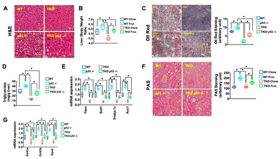 We next wanted to understand the mechanism underlying this susceptibility and focused on the role of p53, which plays a central role in mediating telomere dysfunction-associated metabolic changes [40,41]. To this end, we generated TKO mice that were either proficient or deficient for p53 (TKO/p53 +/+ or TKO/p53 −/−) and used WT and p53 −/− mice as normal telomere controls. Baseline histology and blood chemistry analysis did not show any overt differences between the genotypes on a regular chow diet (data not shown). We then exposed mice of different genotypes to a fructose-rich diet and carried out indirect calorimetry using CLAMS (Comprehensive Lab Animal Monitoring System), which did not reveal any differences in oxygen consumption, carbon dioxide production, respiratory exchange ratio, total energy expenditure, and body temperature (data not shown). By H&E staining over 50%, hepatocytes in TKO/p53 −/− mice had large vacuoles that contrasted with the small vacuoles and in fewer hepatocytes (Figure 4A; n = 6 per group), which paralleled the heavier TKO/p53 −/− livers compared to TKO/p53 +/+ (Figure 4B; n = 6 per group; p < 0.05). ORO staining and TG measurement confirmed the significant difference in TG between TKO/ p53 −/− and TKO/p53 +/+ mice (Figure 4C,D; n = 6 per group; p < 0.05) and this was accompanied by increased levels of genes driving fat synthesis, indicating an important role of p53 in controlling fat metabolism in response to a fructose-rich diet (Figure 4E, n = 6 per group; p < 0.05). Interestingly, p53 deficiency in the setting of long telomeres increased TG accumulation as well, suggesting that p53 in the liver, under metabolic stress, represses fat synthesis, similar to what has been reported for p53 −/− that were exposed to a high fat diet (compare WT to p53 −/−; Figure 4A–D; n = 6 per group, p < 0.05) [45,46]. This was also indicated by the increased expression of key transcription factor Srebp1 and downstream targets FASN and enzyme ACC1 and SCD1 in p53 −/− (mice) compared to WT mice (Figure 4E; n= 6 per group, p < 0.05). Similar to TG accumulation, the glycogen content was affected by p53 status, as documented by the increase of glycogenic enzymes and glycogen in TKO p53 −/− mice (Figure 4G; n = 6 per group, p < 0.05).