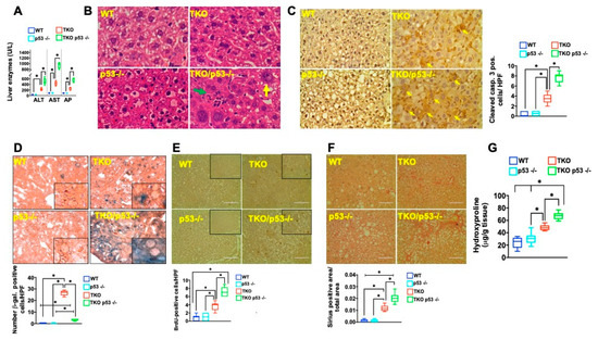 Next, we assessed the functional consequence of p53 deficiency and increased fat synthesis in the context of short and long telomeres. Interestingly, the improved metabolism upon p53 deletion caused further damage in TKO mice compared to TKO mice with intact p53. This was evident in the elevated levels of transaminases and decreased albumin/globulin ratio (Figure 5A and Figure S5A; n = 6 per group, p < 0.05). P53 deficiency also caused significant hepatocyte damage (disintegrating hepatocytes, yellow arrow) and inflammation (leukocytic infiltration, green arrow; Figure 5B; n = 6 per group). This was accompanied by increased apoptosis indicating the existence of p53-independent pathways that induce apoptosis (cleaved caspase 3, Figure 5C; n = 6 per group, p < 0.05). In contrast, the observed increase of senescence in TKO mice on a fructose diet was largely p53 dependent as TKO p53−/− mice showed very few senescent cells compared to TKO p53 +/+ mice (Figure 5D; n = 6 per group, p < 0.05). The increased damage was associated with increased proliferation (Figure 5E; n = 6 per group, p < 0.05) in TKO p53 −/− mice compared to their TKO p53 +/+ counterparts. The increased cell death and proliferation was paralleled by fibrosis in TKO p53 −/− mice as measured by Sirius red staining and hydroxyproline measurement (Figure 5F,G; n = 6 per group, p < 0.05). These changes were telomere length-dependent, as WT or p53 −/− with intact telomeres did not show any of these pathologies (Figure 5A–G; n = 6 per group, p < 0.05). Together, these studies showed that loss of p53 in telomere dysfunctional mice confers increased susceptibility to damage and leads to chronic damage and fibrosis in response to a fructose diet.