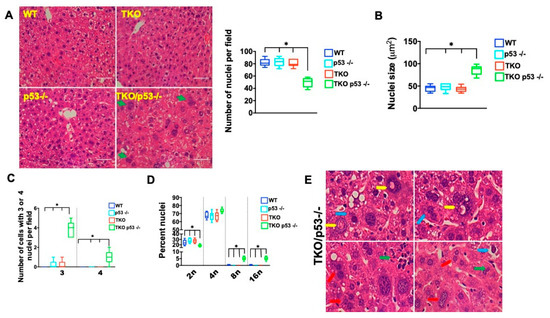 Telomere dysfunction and p53 deficiency, independently, have been shown to affect ploidy under regenerating conditions and we wondered whether increased fructose consumption induced similar changes [47,48,49]. On histological examination, we noticed that the fructose diet induced cellular changes that included an increase in cell and nuclear size, number of nuclei per cell, as well as nuclear abnormalities in TKO mice lacking p53 either on a whole-body level or only in the liver (Figure 6A–E; n = 5 per group and data not shown). Interestingly, TKO p53 −/−, but not TKO p53 +/+ hepatocytes were significantly larger, resulting in fewer cells per field-of-view (Figure 6A; n = 5 per group; p < 0.05). The cell size variability is dependent on increased fructose consumption and p53 status as TKO p53 −/− mice on regular chow or TKO p53 +/+ on a fructose diet do not show any significant changes in cell size (Figure 6B; n = 5 per group; p < 0.05). The cell size changes were accompanied by an increased number of nuclei per cell with a significant increase of hepatocytes carrying three nuclei and, on occasion, four nuclei (Figure 6C; n = 5 per group; p < 0.05). FACS analysis demonstrated a significant increase in polyploidy in TKO p53 −/− mice (Figure 6D; n = 5 per group; p < 0.05). Significant abnormalities in the structure of nuclei were evident in TKO p53 −/− hepatocytes based on the presence of enlarged nucleoli, presence of inclusion bodies, and irregular shape (Figure 6B; n = 5 per group). While these cellular alterations are compatible with dysplastic changes, no frank carcinoma was observed, indicating that additional steps are required for full transformation.