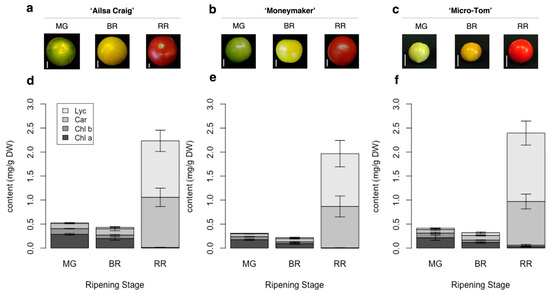 Skin color and pigment content in fruits of three tomato varieties during ripening. (a–c): Appearance and fruit size at different ripening stages of “Ailsa Craig,” “Moneymaker,” and “Micro-Tom.” The white bar indicates 1 cm. (d–f): Quantification of chlorophyll a (Chl a), chlorophyll b (Chl b), total carotenoids except for lycopene (Car), and lycopene (Lyc) content in the three varieties. Each value is shown as the average of biological replicates (n = 3) with standard deviation (SD).