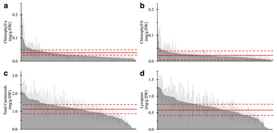 The four-pigment content in ripe fruit of 157 tomato varieties. (a) Chlorophyll a, (b) chlorophyll b, (c) total carotenoids, and (d) lycopene content are shown. The average and SD of the pigment content in AC are represented by the solid and dotted line, respectively. Each value is shown as the average of biological replicates (n = 2–3) and analytical replicates (N = 1–2) with SD.