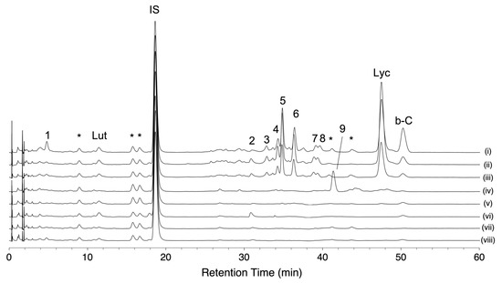 Carotenoid profiles of eight representative varieties analyzed by using HLPC-PDA. Carotenoid profiles were visualized at the wavelength of 450 nm. Each chromatogram shows the pattern of “Ailsa Craig” (i), “Bear Creek” (ii), “Chocolate Cherry” (iii), “Dixie Golden Giant” (iv), “Green Gage” (v), “Green Zebra” (vi), “Lemon Drop” (vii), and “Poire Jaune” (viii). Lycopene (Lyc), beta-carotene (b-C), and lutein (Lut) were identified by comparison to authentic standards. Spectral characteristics of peaks No. 1–9 are shown in Table S5. Peaks with an asterisk are co-eluents that were not carotenoids (see Section 4 in detail).