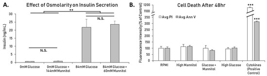 Effects of high glucose and mannitol on mouse islet insulin secretion and cell death. (A) Mouse islets were placed in wells containing modified KRB with 0 mM or 84 mM glucose ± mannitol balanced to 144 mM total for 1h. Increasing osmolarity using mannitol did not significantly alter insulin secretion in glucose-free or high-glucose solutions. Twenty islets per condition in duplicate ran in 2 separate trials (N = 4). (B) Islets were placed in either standard RPMI, high glucose (144 mM), high mannitol (144 mM), or both glucose (60 mM) and mannitol (84 mM). Islets treated overnight with 5 ng/mL IL-1beta and 10 ng/mL TNF-alpha were used as a positive control to show typical fluorescence levels of induced cell death. Islets in each condition ranged from N = 31–37 after combining two separate trials. All data are presented as mean ± SEM. ** p < 0.01, *** p < 0.001, N.S. = Not Significant.
