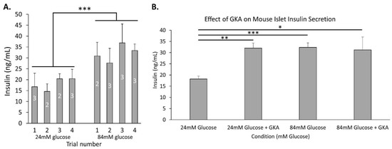 We next conducted a series of trials to determine what drives increased insulin secretion in high glucose. The following studies were all conducted in 24 mM glucose (regarded as maximal) and 84 mM glucose (regarded as extreme). As shown in Figure 4A, insulin secretion was significantly higher in 84 mM glucose compared to 24 mM glucose after combining all trials (p < 0.001). The averages are reproduced for comparisons made in Figure 4B and Figure 5.