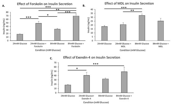 cAMP-related drug effect on insulin secretion in high glucose. (A–C) Murine islets were placed in wells containing modified KRB with 24 mM or 84 mM glucose ± mannitol balanced to 84 mM total for 1 h and then various drugs were added to each condition for 1 h of incubation before insulin was measured: 10 µM forskolin (A), 10 µM MDL 12,330A (B), and 10 nM exendin-4 (C) All data are presented as ± SEM. N = 5–11 replicates. * p < 0.05, ** p < 0.01, *** p < 0.001.