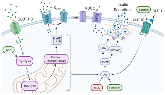 In addition to the triggering pathway, many different intermediate metabolites of glucose and other cellular components are thought to participate in a series of events known as the amplification pathway(s) in which KATP channel closure is not the source of the increased insulin secretion. A review on this topic contained within this special issue describes this pathway as “the sequence of events that enables the secretory response to a nutrient secretagogue to exceed the secretory response of a purely depolarizing stimulus” [15]. Cyclic adenosine monophosphate (cAMP) is a powerful player in the amplification pathway-related insulin secretion. Glucose is a known factor leading to the upregulation of cAMP which is formed from ATP via adenylyl cyclases [16], although the exact mechanism of metabolism stimulated cAMP is unknown. Additionally, there is a glucose-linked amplification pathway that augments insulin secretion through adenylyl cyclase (AC) activation caused by incretin stimulation. Incretins are hormones secreted by endocrine cells in the small intestine after meal ingestion that lead to insulin secretion [12]. Gastric inhibitory polypeptide (GIP) and glucagon-like peptide-1 (GLP-1) are specific incretins that act on the beta cell. Incretins interact with G-protein-coupled receptors at the cell membrane and lead to an upregulation of cAMP [17,18]. The common theme is that cAMP is involved in the early steps leading to insulin secretion in these amplifying pathway(s).