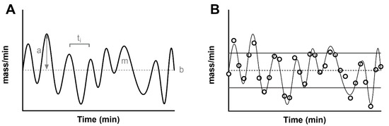 In general, a series of pulses oscillate around the basal, and they can be characterized by an amplitude and a mass. Some methodologies described below assume that pulses strictly arise from the constant basal. With this modelization, the amplitude is always a positive value. By using a more general definition of a stationary signal (a signal whose parameters such as mean and variance remain constant over time), the constant mean of the signal in the time window becomes the measurement of the basal secretion, and the pulses oscillate around it. By definition, a measure such as the standard deviation of the signal can be used to characterize the average variability of fluctuations (pulse mass) above and below the basal (Figure 1B). Similarly, the mass secreted can be calculated as the area under the curve of each pulse.