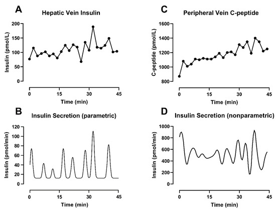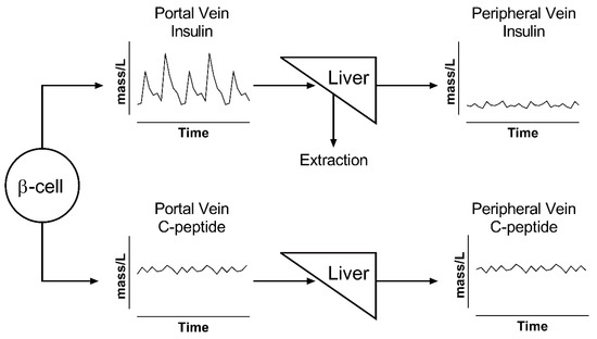 For this reason, multiple investigators chose to use insulin concentration as the main substrate for their analysis [60,61,62,63]. However, their analyses only reflect hepatic vein pulsatile secretion rates, not portal vein rates. Given the nonlinear and pulse-dependent hepatic extraction [36], the two rates above could be significantly different.