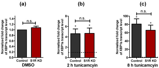 Impact of tunicamycin treatment on XBP1 splicing levels. Bar graphs represent mean ± SEM of spliced XBP1 transcript levels in control and S1R KD SH-SY5Y neuroblastoma cells under control conditions (a) or after tunicamycin treatment for 2 h (b) and 8 h (c). Dashed lines represent the transcript level of spliced XBP1 in the respective DMSO treated cells. Paired t-test, n = 3, * p < 0.05 against corresponding DMSO treated cells; unpaired t-test between control and S1R KD, n = 3, n.s.—not significant.