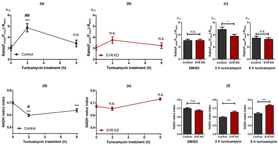We next evaluated mitochondrial NADH redox index [16] as an additional readout for mitochondrial bioenergetics, measured as mitochondrial NADH autofluorescence normalized to the minimum and maximum values achieved by uncoupling and blocking of NADH dehydrogenase complex, respectively. NADH redox index was decreased by 2 h of tunicamycin treatment and less so by 8 h of treatment (Figure 3d), which indicates more energized mitochondria. Since the NADH redox index represents NADH/NAD+ ratio, the decline of this ratio, combined with increased mitochondrial membrane potential and ATP, means more flux of electron donors (NADH) to the electron transport chain (ETC). S1R KD abolished this reduction of the NADH redox index at both time points (Figure 3e). The difference between the control group and the S1R knock-down was only apparent during ER stress induction by tunicamycin treatment (Figure 3f).