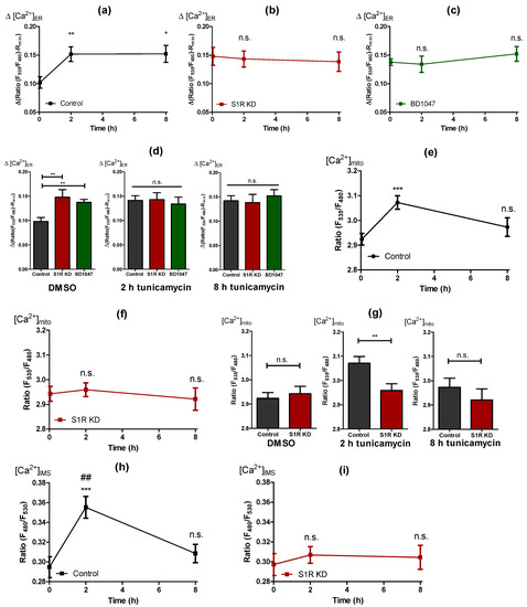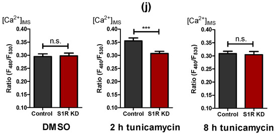 To test whether the observed differences in mitochondrial Ca2+ were due to the direction of the ER Ca2+ leak and not associated with Ca2+ “permeability” of the mitochondrial inner membrane, we measured Ca2+ levels in the mitochondrial inter-membrane space (IMS) using a recently developed IMS-targeted genetically encoded ratiometric Ca2+ sensor, IMS-GEM-GECO [19,20]. IMS Ca2+ closely followed the same trends as the mitochondrial Ca2+, with an increase after 2 h of tunicamycin treatment, which was normalized after 8 h of treatment (Figure 4h and Figure S5a). In S1R depleted and BD1047 treated cells, tunicamycin treatment did not elevate IMS Ca2+ after 2 h and 8 h (Figure 4i,j and Figure S5b,c), thus supporting our assumption of a specific role of S1R as an orchestrator of the enhanced ER Ca2+ leak during early ER stress, directing the Ca2+ leak towards mitochondrial Ca2+ uptake sites.