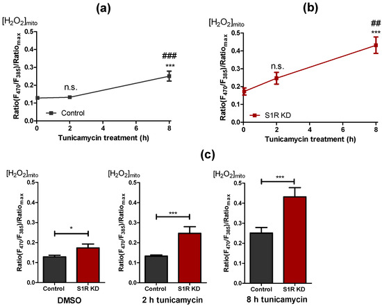 S1R KD is accompanied by increased ROS levels. Time course of mitochondrial H2O2 levels after tunicamycin treatment, presented as mean ± SEM and assessed by the mitoHyPer7 in control SH-SY5Y cells (a) and in cells with S1R KD (b). Bar graphs represent mean ± SEM of mitochondrial H2O2 levels in control (black) and S1R KD (red) cells before tunicamycin treatment (left), after 2 h (middle), or 8 h (right) tunicamycin treatment (c). Comparison of the mitochondrial ROS level in control and S1R KD cells at corresponding treatment durations (error bars are SEM); One-way ANOVA with Tukey’s multiple comparison test (a,b), *** p < 0.001, ## p < 0.01 (for b, S1R KD 8 h against S1R KD 2 h), ### p < 0.001 (for a, control 8 h against control 2 h), n.s.—not significant; unpaired t-test (c), * p < 0.05, *** p < 0.001; Control DMSO (22 cells/7 experiments), Control 2 h tunicamycin (32 cell/10 experiments), Control 8 h tunicamycin (22 cells/6 experiments), S1R KD DMSO (19 cells/9 experiments), S1R KD 2 h tunicamycin (27 cells/10 experiments), S1R KD 8 h tunicamycin (19 cells/6 experiments).