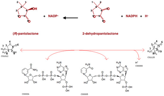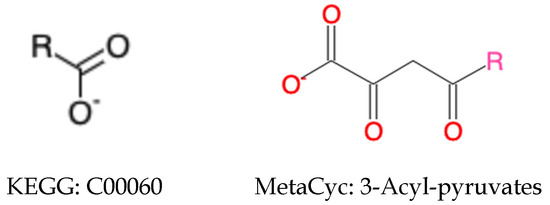 Reaction pair MetaCyc 1.1.1.168-RXN (top, https://metacyc.org/META/NEW-IMAGE?object=1.1.1.168-RXN&&redirect=T accessed on 1 April 2021) and KEGG R03155 (bottom, https://www.genome.jp/entry/R03155 accessed on 1 April 2021) with the same atom mappings.