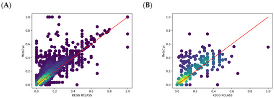 Scatter plots of changed one-bond atom color fraction for KEGG versus MetaCyc atom mappings in paired reactions. Lighter colors represent higher overlapped point density. (A) All paired reactions are included; (B) Reaction pairs with inconsistent atom mappings are included.