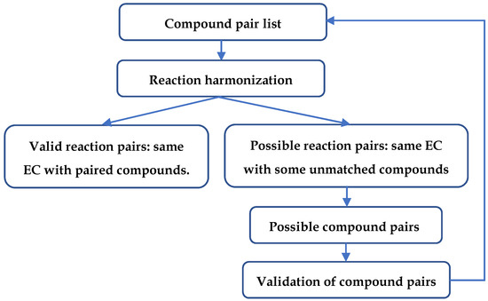 The flowchart of steps in compound and reaction harmonization is shown in Figure 12. The initial compound pair list is composed of compound pairs detected by the loose compound coloring identifiers. Next, reaction harmonization is conducted with the compound pair list. Two criteria are obeyed in reaction harmonization: the two reactions should share at least one EC number and all compounds in the two reactions are paired unless one reaction has an extra compound entity, like H+. Apart from valid reaction pairs, reaction pairs with the same EC number and some unmatched compounds are also extracted. We hypothesized that those unmatched compounds are likely to be compound pairs. Validation is conducted for the unmatched compounds, and the valid compound pairs are added to the compound pair list. Every time the compound pair list is updated, the above process is repeated until no new compound pairs are discovered.
