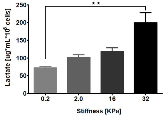 RMF-621 cells behave as lactate producer cells in a stiffness-dependent manner. Mammary human stromal cells (RMF-621 cells) were previously cultured (3 days) in media enriched with 10% FCS on a 0.2 kPa low-rigidity matrix (Advanced Biomatrix) to simulate the normal soft condition of breast tissue. After this, the cells were transferred to a set of matrices with increasing stiffness (0.2, 2.0, 16, and 36 kPa) for 72 h. Further, the lactate present in serum-free medium was evaluated, as explained in Section 4. The data are presented as the means ± standard error (SEM). (**) indicates statistically significant differences, with p ≤ 0.01 using Kruskal–Wallis test, followed by Dunn’s multiple comparisons test.