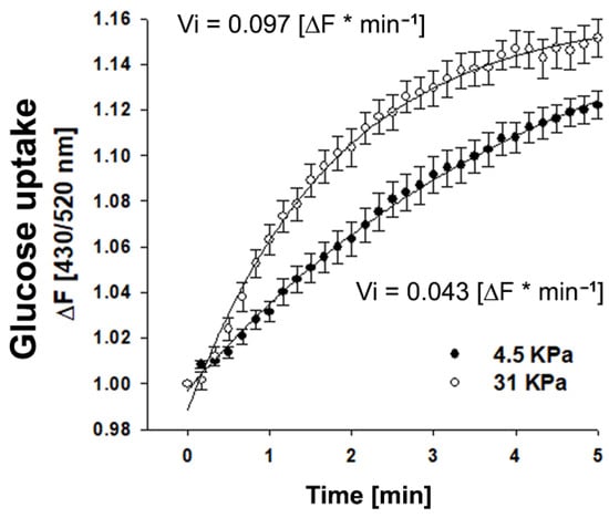 To assess whether matrix stiffness affects the ability of stromal cells to uptake glucose, we plated RMF-621 cells on coverslips coated with an elastic polyacrylamide gel that generates matrices with stiffnesses of 4.5 and 31 kPa, to which type I collagen was covalently cross-linked []. The cells were incubated for 3 days in this condition prior to being transduced (for 24 h) with an adenovirus that encoded the FRET glucose imaging biosensor FLIPglu-60060Δ6, which displays a high affinity for glucose []. As Figure 2 shows, cells seeded on a stiffer matrix exhibited consistently higher incorporation of glucose (double V initial value) that allows us to suggest that a rigid microenvironment can favor glucose uptake and incorporate substrate for metabolic reprogramming.