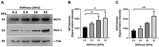 Next, we assessed whether a culture of RMF-621 cells on matrices with different stiffnesses was able to modulate the expression of transporters involved either in the uptake of glucose by Glut1 or the export of lactate by MCT4, a monocarboxylate transporter that appears to be the main mechanism adapted to the release of lactate []. Figure 3 shows a Western blot of both transporters expressed by RMF-621 cells cultured for 72 h on matrices of increased stiffness. As Figure 3 indicates, both Glut1 and MCT4 protein expression was stimulated by matrix stiffness. These results allow us to argue that stiffer conditions favor glucose uptake and lactate export.