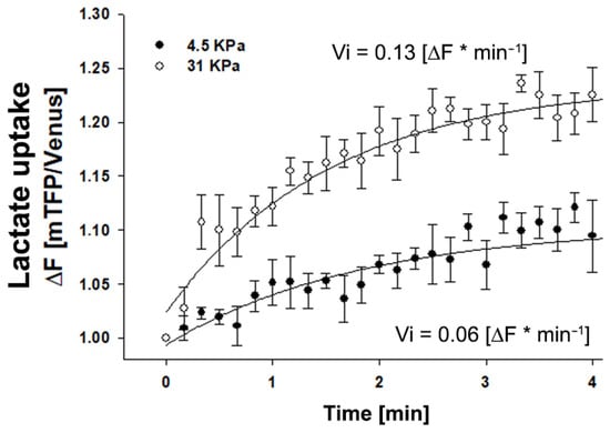 Lactate transport is favored in mammary MDA MB-231 cells cultured in rigid matrices. Time course curve of lactate incorporation in MDA MB-231 cells measured as the fluorescence ratio of a LACONIC biosensor. Cells were cultivated for 4 days on coverslips coated with an elastic polyacrylamide gel to which type I collagen was covalently cross-linked, and then exposed to 5 mM lactate. Fluorescence was recorded every 10 sec. Open circles correspond to cells cultured on a soft matrix (4.5 KPa), and closed circles to cells cultured on a stiffer matrix (31 KPa). The data correspond to an average of three single cells recorded in two independent experiments. The continuous line represents the best fit of a double rectangular hyperbola, and Vi values were estimated from the slope of each lactate uptake curve.