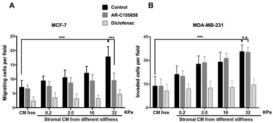 To test whether stromal soluble factors secreted by RMF-621 cells cultured on a range of matrices with different rigidity can influence the migratory behavior of their epithelial counterpart, we designed the following experiments. Using MCF-7 cells (a weakly migratory mammary cell line) and MDA MB-231 (a highly invasive cell line), we performed migratory and invasion experiments using the Transwell system, in which epithelial cells migrated via attraction by the stimulus of 50% media conditioned by RMF-621 cells previously cultured on different matrices. This medium occupied the lower space of the Transwell chamber. To analyze whether lactate produced by these stromal cells plays a role in the migratory stimulus, both epithelial cells were allowed to migrate in the presence of 1 µM MCT1/2 inhibitor ARC155858 [] and 1 mM diclofenac, a structurally-unrelated MCT1 and MCT4 blocker []. As Figure 5 shows, in both cell lines, epithelial cell migration responds to stiffness-derived stromal stimulus in a directly proportional way, that is, media conditioned from RMF-621 cells cultured on a more rigid matrix generate a more vigorous migratory stimulus. The figure also shows that both ARC155858 and diclofenac inhibit cell migration (to different degrees) in MCF-7 cells, suggesting that in these cells, lactate, incorporated via the abundantly expressed MCT1 transporter [], was at least partially responsible for epithelial migration, at least in the higher stiffness levels. On the other hand, MDA MB-231 cell invasion was insensitive to ARC155858 and lactate-dependent invasion was blocked only by diclofenac. These results suggest that in our experimental conditions, MDA MB-231 cells incorporate lactate using MCT4, a monocarboxylate transporter predominantly expressed in these cells, the expression of which has been associated mainly with lactate export. [,].