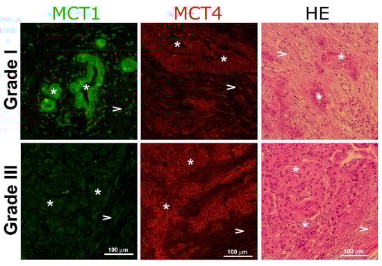 Monocarboxylate expression in human breast cancer samples. Representative immunohistochemical staining of human breast tumor samples with different Elston grades stained for MCT1 (green) and MCT4 (red), taken with a magnification of 20×. The third column represents the control stain with hematoxylin-eosin. Asterisks (*) indicate epithelial cells and arrow heads (>) show stromal cells.