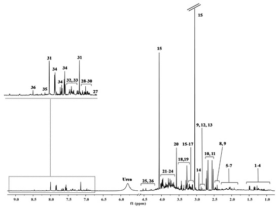 The major spectral area assignments of a representative 1H-NMR spectra of urine. Metabolites were identified based on literature information and by using a dedicated library, such as the Human Metabolome Database (HMDB, http://www.hmdb.ca, accessed on 29 March 2020) and the 500 MHz library from Chenomx NMR suite 7.1. Peaks: (1) 3-methyl-2-oxovalerate, (2) 2-hydroxyvalerate, (3) isoleucine, (4) valine, (5) 2-aminoadipate, (6) homoserine, (7) glutamine, (8) pyruvate, (9) 3-phenylpropionate, (10) citrate, (11) dimethylamine, (12) trimethylamine, (13) asparagine, (14) dimethylglycine, (15) cis-aconitate, (16) ethanolamine, (17) o-phosphocholine, (18) trimethylamine n-oxide, (19) taurine, (20) glycine, (21) creatine, (22) creatine phosphate, (23) guanidinoacetate, (24) glycolate, (25) threonine, (26) cytidine, (27) 3-hydroxykynurenine, (28) 3-hydroxymandelate, (29) tyrosine, (30) kynurenine, (31) histidine, (32) phenylacetylglycine, (33) tryptophan, (34) hippurate, (35) nicotinic acid, (36) formate.
