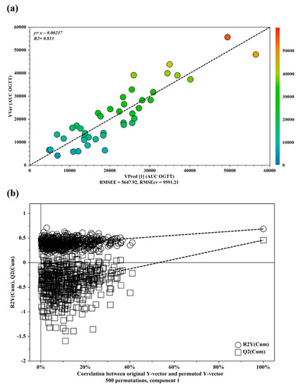 (a) OPLS plot showing the relationship between the metabolic profile and the AUC OGTT values. The horizontal axis represents the observed values, and the vertical axis represents the predicted values. (b) Validation plots of OPLS model using a permutation test. The horizontal axis shows the correlation between the permuted and actual data, while the vertical axis displays the cumulative values of R2 and Q2. The intercept gives an estimate of the overfitting phenomenon.