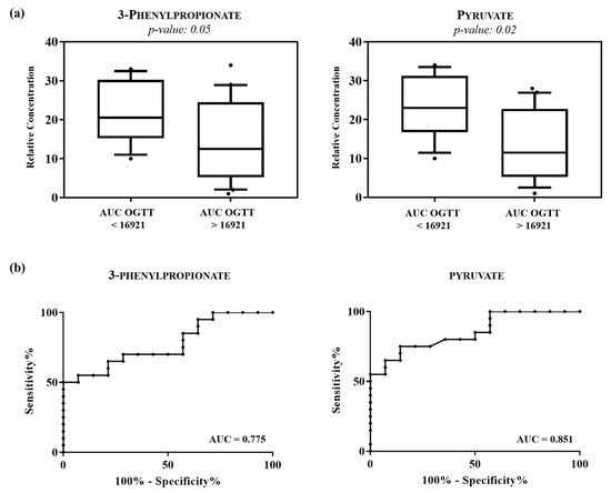 The discriminant metabolites based on VIP values of > 1, such as 2-aminoadipate, 3-phenylpropionate, pyruvate and trimethylamine were quantified using Chenomx NMR suite 7.1 and subjected to the Mann-Whitney U test to determine their statistical significance. The results of the univariate statistical analysis showed that only 3-phenylpropionate and pyruvate changed significantly in subjects characterized by AUC OGTT value > 16,921 compared with subjects with value < 16,921 (Table 4a). The relative concentrations of these metabolites in the two groups were compared using box-and-whisker plots. As shown in Figure 3a, subjects with AUC OGGT > 16,921 were characterized by a lower level of 3-phenylpropionate and pyruvate compared with subjects with AUC OGGT value < 16,921. Finally, the individual ROC for each metabolite was built and shown in Figure 3b. The corresponding statistical parameters are reported in Table 4b. The receiver operating characteristic (ROC) curve and the determination of the area under the curve (AUC) is a commonly used method to evaluate the diagnostic potential of a classifier in clinical applications. Subsequently, to evaluate if the model showed a sensitivity and specificity better than the single metabolites, a ROC curve was constructed by using the combination of the two metabolites. The results of the analysis showed an AUC of 0.875 (95% CI: 0.754–1.00), indicating how the combination of the metabolites exhibit an AUC slightly higher compared to the single pyruvate metabolite (Figure S1, supporting information).