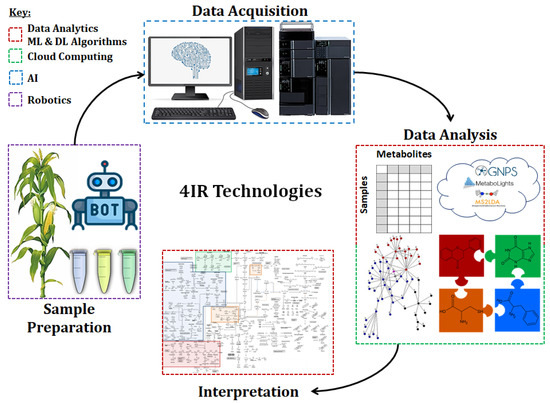 Metabolomics is classically defined as an omics science that aims at the analysis of the entire complement of small molecular weight molecules, namely metabolites (≤1500 Da in size), within a biological system under given physiological conditions [29,31]. Metabolomics incorporates the domains of biology, chemistry, chemometric, statistics and computer science. This multidisciplinary scientific field has matured over the last two decades and has gained popularity, particularly in the life sciences, and is becoming indispensable in interrogating cellular biochemistry and elucidating the mechanisms responsible for metabolic changes in response to different physiological conditions [5,32,33,34,35]. In plant sciences, metabolomics has been successfully applied in a broad spectrum of studies including metabolic pathway studies [29], relating genotype and biochemical phenotype [36], silent phenotype mutations [37], plant-environment interactions [27] and plant priming, a phenomenon that pre-conditions plants for enhanced defense against stresses [38]. Metabolomics, particularly for large scale studies, is, however, limited by various bottlenecks; hence, the focus to overcome these challenges has intensified through the development of computational metabolomics tools and improved technologies [9], most of which are 4IR-driven (Figure 1) and are articulated in the following sub-sections on 4IR technologies in metabolomics workflows.