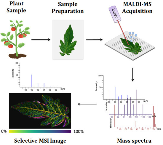 A general overview of a matrix-assisted laser desorption/ionization-mass spectrometry imaging (MALDI-MSI) workflow. A tissue (leaf) is sectioned from the sample (tomato plant) and mounted on a target surface. A matrix is applied to the tissue and a laser beam extracts metabolites into a mass analyzer. Mass spectra are generated at each x,y coordinates across the tissue surface. A software algorithm combines and processes the mass spectra and generates a MSI image.
