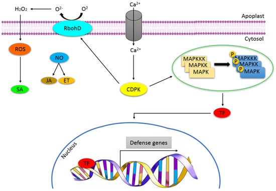 Overview of defence signalling in plants under abiotic stress. Upon perception of stress, several secondary messengers such as ROS and Ca2+ and NO are activated, which then induce different kinases such as CDPKs and MAPKs, resulting in the activation of transcription factors, enzymes and proteins which, in turn, activate the transcription of defence-related genes. Phytohormones, salicylic acid (SA), jasmonic acid (JA) and ethylene (ET), are also induced and contribute to plant immunity.