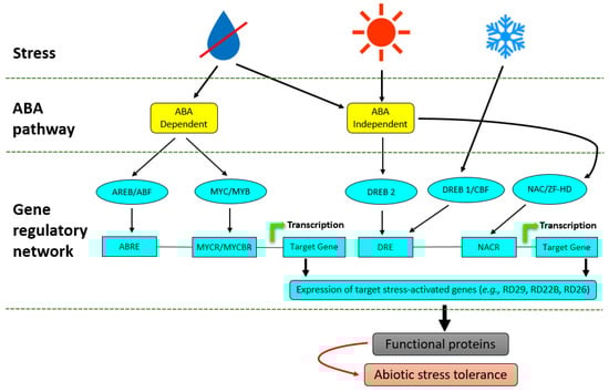 Numerous regulons that are activated in response to abiotic stress have been identified in plants and are components of ABA, a principal phytohormone involved in the regulation of abiotic stress in plants by regulating an intricate gene regulatory system that permits plants to tolerate environmental perturbations [84]. Myeloblastosis oncogene (MYB)/myelocytomatosis oncogene (MYC) and the ABA-responsive element-binding protein/ABA-binding factor (AREB/ABF) regulons function in ABA-dependent gene activation pathways [85], whereas dehydration-responsive element-binding protein 1 (DREB1)/C-repeat binding factor (CBF), DREB2, NAC (CUC, NAM and ATAF) and the zinc-finger homeodomain (HD) regulons function in ABA-independent gene expression (Figure 2). The different TFs involved in stress tolerance normally function independently of each other; however, it has been shown that the ABA-dependent and ABA-independent pathways converge at several points representing transcriptional repressors and enhancers which may interact directly or indirectly with the DREB and AREB, and hence initiate synergistic interactions between cold, drought and salinity stress [86,87].