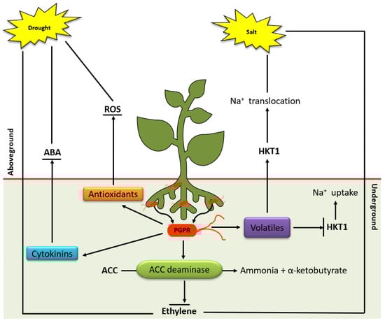 Overview of induced systemic tolerance elicited by PGPR against drought and salinity stress. Broken arrows indicate compounds secreted by PGPR under stress including cytokinin, antioxidants, ACC deaminase and volatiles. Cytokinins and antioxidants result in ABA accumulation and ROS degradation, respectively. ACC deaminase degrades ACC and inhibits ET production. The volatiles emitted by PGPR downregulates HKT1 expression in roots but upregulation in shoot tissue, resulting in the recirculation of Na+ in the whole plant under high salt conditions.