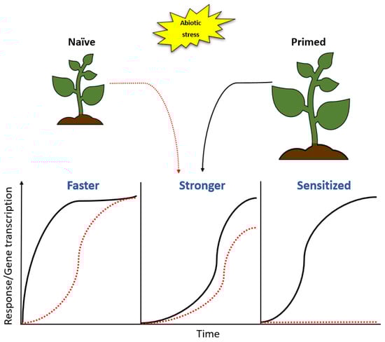 Priming modifies responses upon stress encounter. A naïve plant may be primed by either exposure to stress or other priming factors such as microbes. Response patterns differ in primed and naïve plants; the primed plant may respond to inducing stress more rapidly or more robustly than a naïve plant. It may also be sensitised so that the response is triggered at a lower fitness cost. The primed plant may further modify its response mechanisms to regulate a network of genes that is different from that found in a naïve plant.
