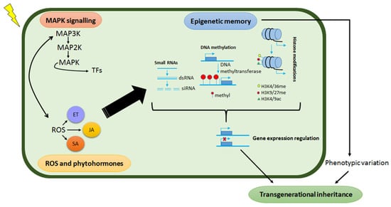 Simplified model of abiotic stress signalling pathways and their role in transgenerational epigenetic memory. Perception of environmental stress by plants induces the accumulation of ROS, which in turn promotes the production of phytohormones including SA, JA and ET. ROS further induce a MAPK signalling cascade that activates transcription factors, driving defence-related gene transcription. These stress-induced changes modulate the epigenetic landscape (small RNAs, DNA methylation and histone modifications) which subsequently affect gene expression patterns in response to abiotic stress. These epigenetic variations can be transient and revert to the initial epigenetic state. In some cases, induced epigenetic variations may be transmitted transgenerationally and may become adaptive if the offspring experiences environmental signals similar to the previous generation.