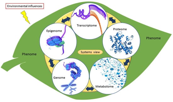 The metabolome comprises a pool of low-molecular-weight metabolites usually less than 1500 Da. These metabolites are considered final products of cellular regulatory processes (gene expression and protein activity), modulating processes between the genome and the environment. In this regard, metabolomics is a cornerstone in the integration of the ‘-omics’ technologies that contribute to a systems biology overview (Figure 6). As such, it assists in providing a holistic understanding of the organisation principle of cellular functions at different biological information levels and in providing ways of monitoring biological processes in an integrated system [27] (Figure 6). Metabolites form an indispensable part of the plant metabolism, influencing all biological processes such as plant defence or tolerance to abiotic stresses [247]. As a high-throughput technology, metabolomics has been extensively used for various studies ranging from drug discovery, enzyme discovery, nutrigenomics, microbial biotechnology, toxicology, to crop and stress tolerance improvement in plants [248].