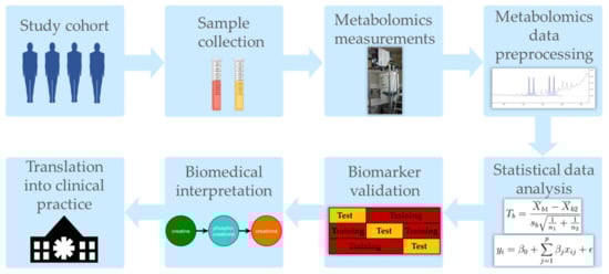 Probably the main goal of metabolomics analyses in biomedical research is the detection of powerful metabolic biomarkers for disease diagnosis or prognosis, response to therapeutic interventions, or, in general, response to external stimuli, e.g., nutrition or exercise. The NIH defines the term “biomarker” as “a characteristic that is objectively measured and evaluated as an indicator of normal biological processes, pathogenic processes, or pharmacologic responses to a therapeutic intervention” []. The search for novel metabolic biomarkers in the context of nephrology, as illustrated in Figure 2, is a highly emerging research area. From a statistical point of view, several different approaches can be distinguished (Table 3):