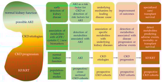 Possible research questions, kidney related prerequisites, and study cohort types used for metabolomics studies. Abbr.: AKI, acute kidney injury; CKD, chronic kidney disease; eGFR, estimated glomerular filtration rate; KF, kidney failure; KRT, kidney replacement therapy.