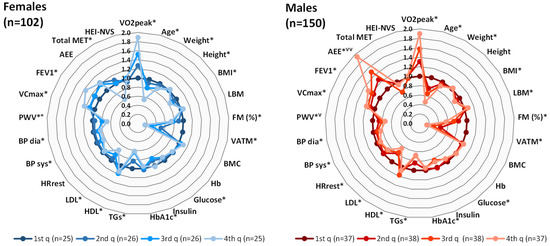 Radar plots visualizing the basic characteristics of KarMeN participants according to sex-specific VO2peak quarters. The means of the 1st q were used as reference values to the means of the 2nd, 3rd and 4th q. *: significant differences between quarters according to the Welch ANOVA. °: n = 23 (1st q), n = 25 (2nd q); ⱽ: n = 36 (1st q); ⱽⱽ: n = 35 (1st q), n = 37 (2nd q). AEE: activity energy expenditure; BMC: bone mineral content; BMI: body mass index; BP: blood pressure; dia: diastolic; FEV1: forced expiratory pressure in one second; FM: fat mass; Hb: hemoglobin; HDL: high-density lipoprotein; HEI-NVS: Healthy Eating Index (modified version); HRrest: resting heart rate; LBM: lean body mass; LDL: low-density lipoprotein; MET: metabolic equivalent of task; PWV: pulse wave velocity; q: quarter; sys: systolic; TGs: triglycerides; VATM: visceral adipose tissue mass; VCmax: maximal vital capacity; VO2peak: peak oxygen uptake.