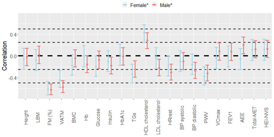 To examine sex-specific relations between the VO2peak and selected phenotypical as well as clinical variables, correlations adjusted for age (and menopausal status in females) were calculated. A visual comparison of the pairwise correlations in women and men is provided in Figure 2. After adjustments for the above-mentioned confounding factors, the VO2peak in females showed positive correlations with HDL cholesterol (r = 0.43) and negative correlations with the FM (%) (r = −0.61), VATM (r = −0.44), PWV (r = −0.38), and TGs (r = −0.33), that were all significantly different from zero. In males, not only HDL cholesterol (r = 0.29) but also the AEE (r = 0.20) showed positive correlations with the VO2peak. Compared to females, negative correlations to the VO2peak that were significantly different from zero were not only detected for the FM (%) (r = −0.62), VATM (r = −0.57), PWV (r = −0.32), and TGs (r = −0.25) but additionally for HRrest (r = −0.30), diastolic BP (r = −0.27), LDL cholesterol (r = −0.22) and insulin (r = −0.18).